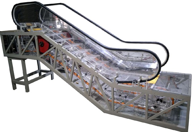 透明教學自動扶梯模型,適用于職業院校、中職院校電梯技術專業學員進行自動扶梯梯級拆裝、操縱和維修保養實訓教學訓練。扶梯模擬實訓裝置采用優質方管焊接密紋噴塑組裝成扶梯桁架,梯級踏板系統、扶手帶系統、曳引機系統,設備臺架、安全檢測系統,電氣控制控制系統等。
